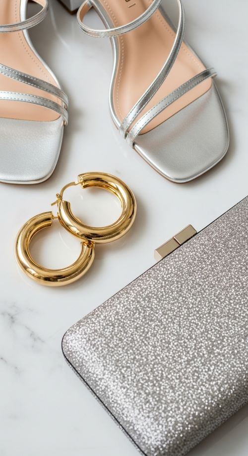 If you’re new to metallics, start with accessories. A silver belt, gold heels, or a rose-gold bag can instantly elevate a simple outfit. Metallic shoes add shine without overwhelming your look, while bags like a clutch or crossbody in a subtle shimmer make a statement. Stacking gold or silver rings or opting for statement earrings in a metallic finish can also elevate your style. Pair metallic accessories with neutral colors like black, white, beige, or navy to let the shine pop.