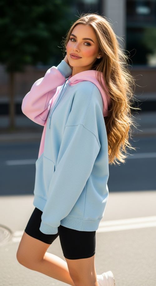Hoodies and biker shorts make a sporty oversized combo. Oversized hoodies add dimension while biker shorts keep the look sleek. DIY tip: cut old hoodies into cropped or slightly distressed styles for a playful twist. Sneakers complete the ensemble, making it perfect for walks, errands, or casual hangouts. Play with colors or patterns for personal flair. Accessorize with a cap or mini backpack. This outfit blends comfort, casual energy, and modern style effortlessly.