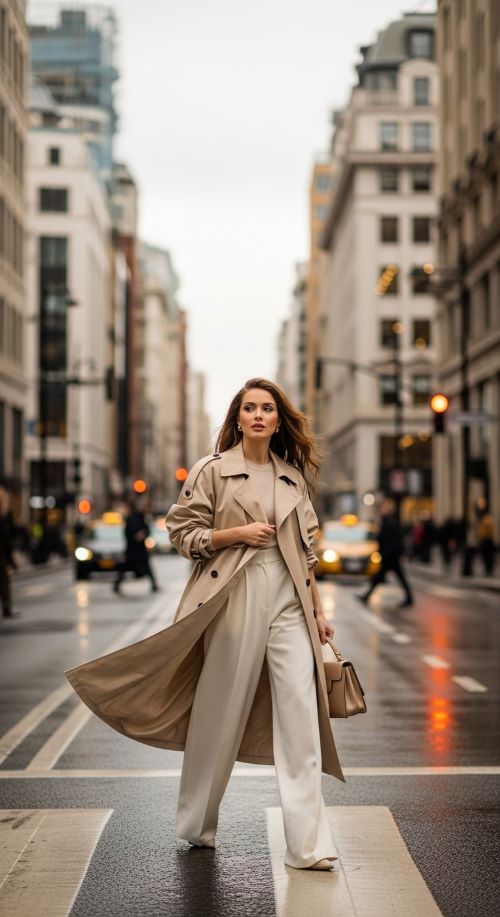 Trench coats over wide-leg trousers create a flowing, elegant vibe. Oversized coats make a statement, while wide-leg trousers maintain balance. Affordable styling: find classic trench coats at thrift stores and pair with neutral trousers. Add pointed flats or loafers for professional polish. Scarves or belts can subtly add shape. This combo works for workdays or casual city strolls. Comfort meets sophistication in a simple, easy-to-wear package.