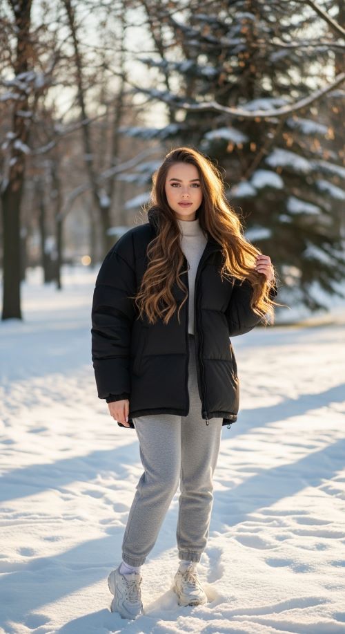 Oversized puffers keep winter comfortable while looking stylish. Joggers balance the bulk of the jacket, keeping the silhouette relaxed but structured. Budget tip: repurpose old jackets or thrift sporty layers. Sneakers add casual flair. Layering turtlenecks or hoodies underneath maximizes warmth and style. Perfect for errands, walks, or casual outings.