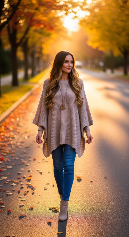 Ponchos create flowing silhouettes without sacrificing comfort. Pair with jeans or leggings for proportion. Affordable styling: DIY from oversized scarves or thrift knits. Boots or sneakers complete the look. Perfect for layering in autumn. Minimal accessories keep the focus on texture and shape.