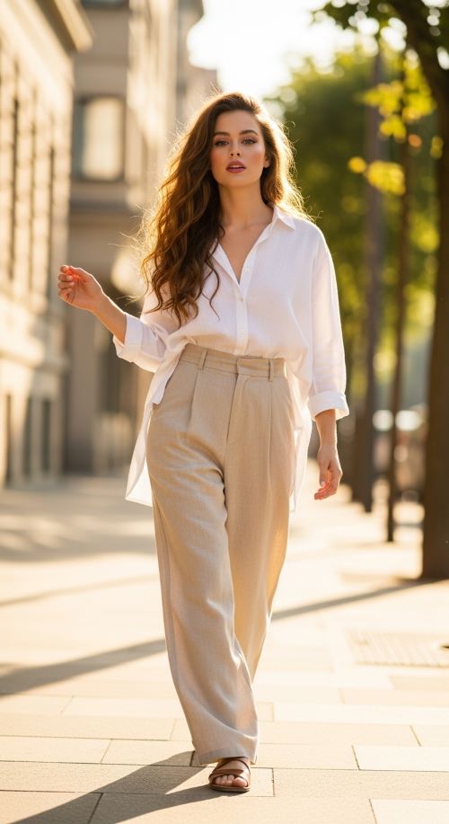 Oversized linen shirts and wide-leg pants are breathable and chic. Tuck loosely or knot at the side for style. Affordable tip: thrift neutral linens or DIY with old oversized shirts. Sandals or flats keep summer-ready. Perfect for warm-weather outings, travel, or casual brunches.