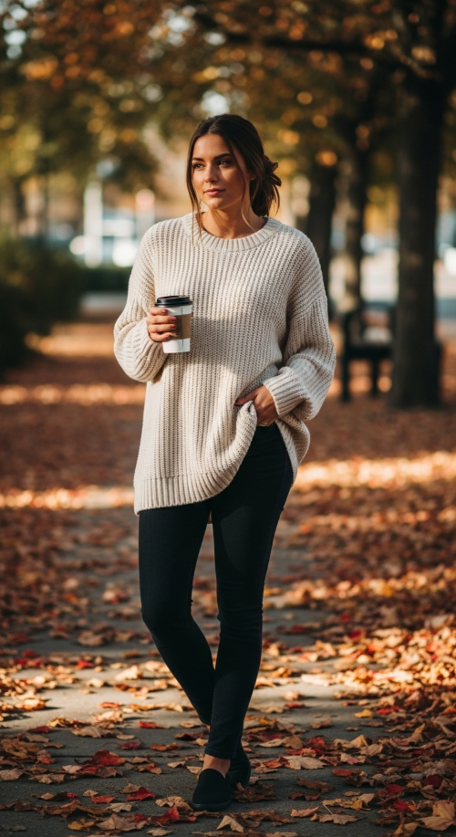 A chunky cardigan over leggings is perfect for relaxed fall days. Layer a long tee or tunic underneath. Choose warm, neutral shades for easy mixing. Pair with boots or casual sneakers. DIY tip: fringe the edges of an old cardigan for a refreshed look. Add a scarf for extra coziness. This outfit is ideal for running errands or lounging with friends.