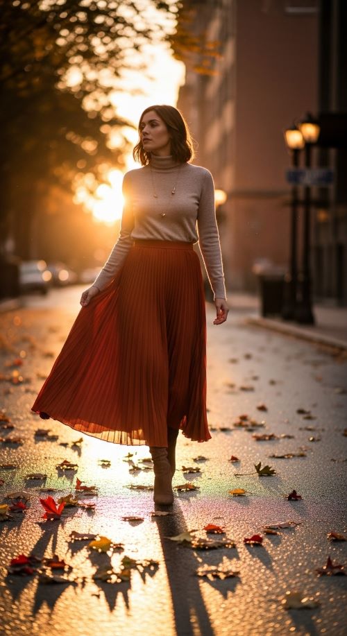 A turtleneck paired with a midi skirt balances warmth and femininity. Choose earth tones like brown, mustard, or burgundy. Tuck in the sweater to define your waist. Layer tights underneath for extra warmth. This outfit works with boots or flats. DIY tip: swap your old pencil skirts for pleated styles by folding and sewing simple pleats. Add a belt to change the silhouette. It’s easy to make your old pieces feel fresh.