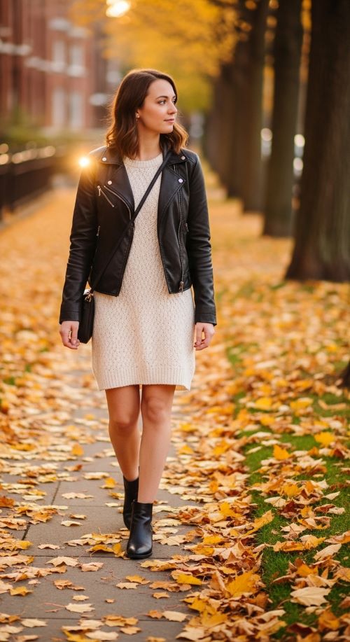 A leather jacket over a knit dress gives a chic edge to cozy fabrics. Dresses in neutral shades work best. Layer with tights in cold weather. Boots can be ankle or knee-high. For DIY flair, add patches to an older leather jacket. The mix of textures—smooth leather and soft knit—adds dimension. This outfit is versatile for daytime walks or casual dinners. Keep jewelry minimal for effortless appeal.
