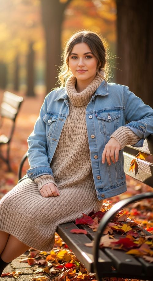 Sweater dresses are fall-friendly and easy to wear. Layering a denim jacket adds structure and casual style. Pair with ankle boots or sneakers. Belt the dress for a more defined look. For budget-friendly options, thrift old denim jackets or repurpose oversized button-ups as light jackets. This outfit works for school, coffee dates, or casual weekends. Accessories like a knit beanie can complete the look affordably.