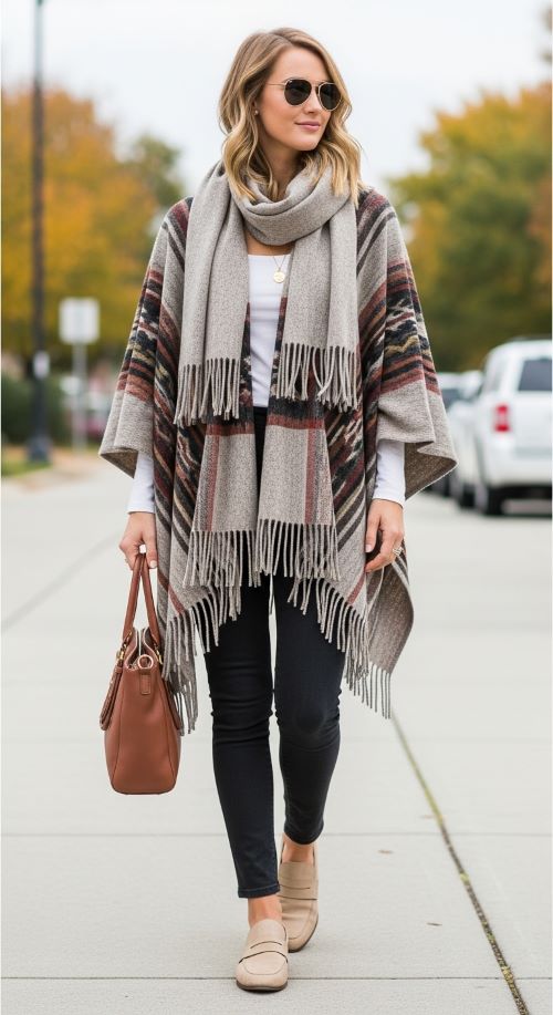 Ponchos are stylish and practical for fall. Layer over a fitted top and skinny pants to balance the loose silhouette. Neutral shades work well, but adding a patterned poncho can make the look pop. Boots or loafers complete the outfit. DIY tip: fringe an old scarf to create a new poncho quickly. Great for weekend markets or casual strolls, this look is simple and comfortable.