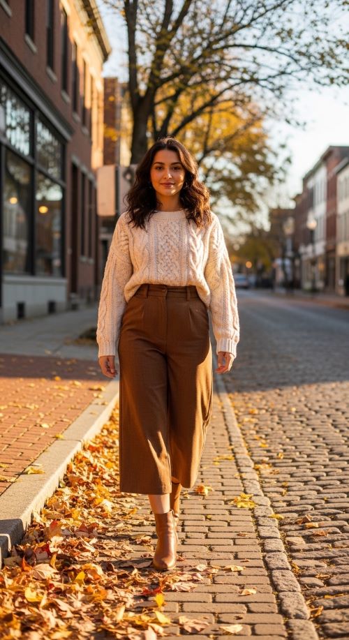 Sweaters with culottes combine comfort and trendiness. Tuck the sweater in to define your waist. Add boots or sneakers depending on activity. DIY: hem old wide-leg pants into culottes for an affordable alternative. This outfit works for casual office days or weekend brunches.