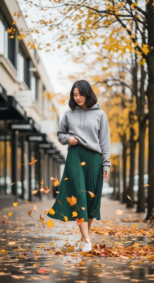 Pairing hoodies with skirts creates a casual-chic vibe. Choose neutral hoodies with patterned or solid skirts. Tuck slightly in the front for shape. DIY idea: add patches or embroidery to a plain hoodie for personality. Sneakers or boots work well. This combination works for casual outings, coffee runs, or laid-back office settings.