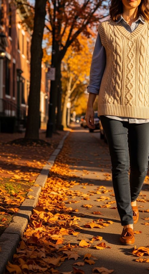 Vests are versatile layering pieces. Wear over shirts or lightweight turtlenecks. Pair with jeans or skirts. DIY tip: repurpose old sweaters into sleeveless vests with simple cutting and stitching. Add boots or loafers depending on activity. This outfit works for casual or semi-formal settings.