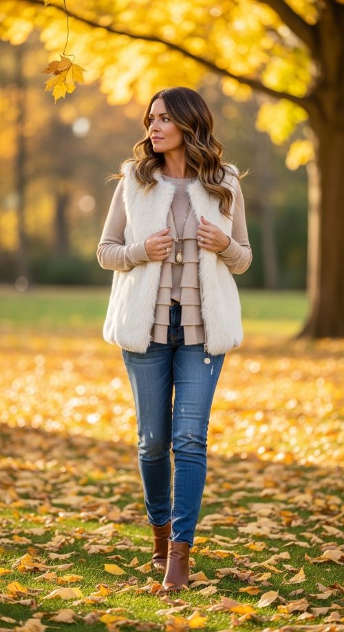 Faux fur vests add texture and warmth. Layer over long-sleeve tops or shirts. Pair with jeans or skirts. DIY: cut and sew old faux fur fabric into a vest for a budget-friendly option. Boots or flats complete the look. Perfect for fall outings where warmth and style are needed.