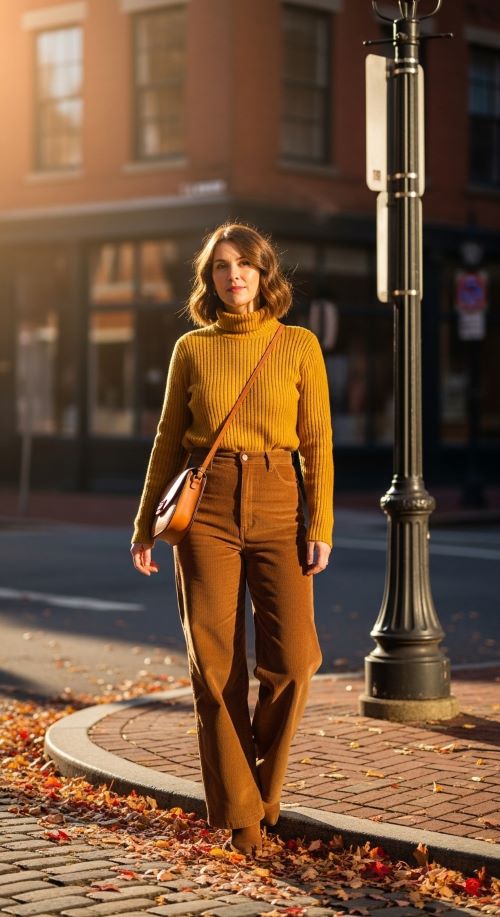 Turtlenecks with corduroy pants create a retro-inspired fall look. Earthy shades like brown, mustard, or rust work well. Add ankle boots or loafers. DIY: upcycle old corduroy skirts or pants into fitted trousers. This outfit is versatile for casual or semi-casual settings, and adds texture and warmth without bulk.