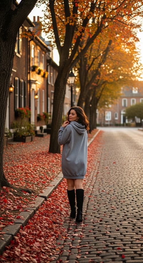 Hoodie dresses are comfy and stylish. Pair with boots or sneakers. DIY: add drawstrings or patches to plain hoodies for a personal touch. This outfit works for casual outings or relaxed weekends. Layer with a jacket if needed for colder days.