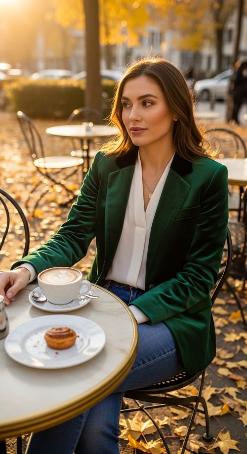 Velvet blazers add luxury without effort. Pair with casual jeans for balance. Choose autumnal shades like burgundy, forest green, or navy. DIY idea: repurpose old velvet fabric into a cropped blazer for a unique twist. Pair with boots or heels. This outfit works for casual evenings or daytime events.
