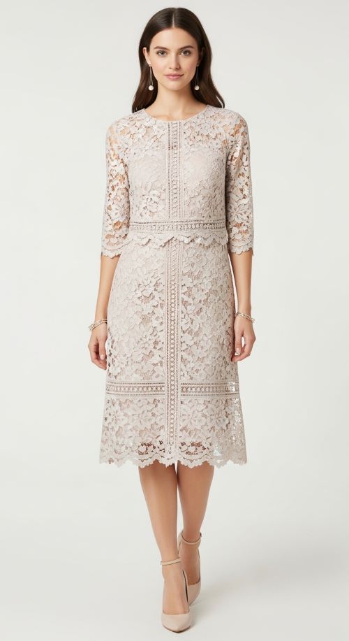 Lace overlay dresses are romantic and timeless. They work well in soft neutrals or pastels. Pair with nude heels and simple jewelry to keep the focus on the dress. For a budget-friendly hack, add lace trim to a plain dress to create a custom look. Lace adds texture and elegance without the need for extra accessories. Knee-length versions are perfect for semi-formal weddings, keeping the look refined and practical. This style blends classic charm with modern flair effortlessly.