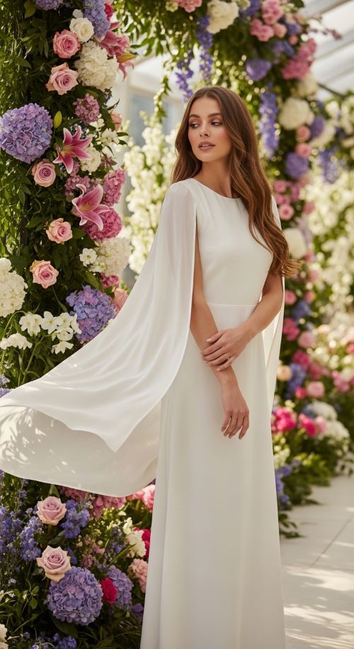 Cape sleeves add subtle drama to a simple dress. This style is elegant without being flashy. Pair with minimal jewelry and classic heels to keep the focus on the sleeves. On a budget, add detachable cape details to a plain dress for DIY glamour. Flowy fabrics like chiffon or lightweight satin work best. Cape sleeve dresses are ideal for formal or semi-formal weddings, offering comfort, movement, and elegance in one look.