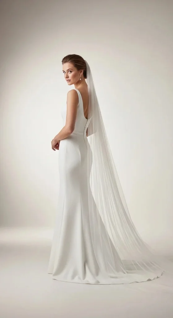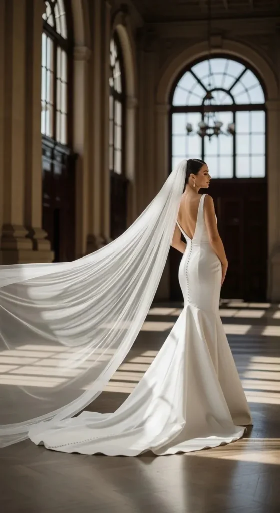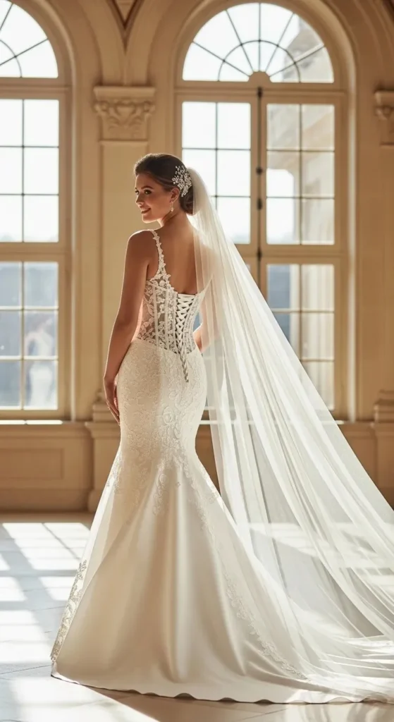 A satin mermaid dress creates a clean, polished look. When paired with a cathedral veil, it instantly feels dramatic.