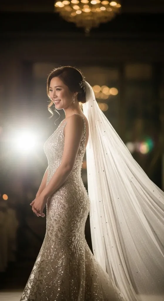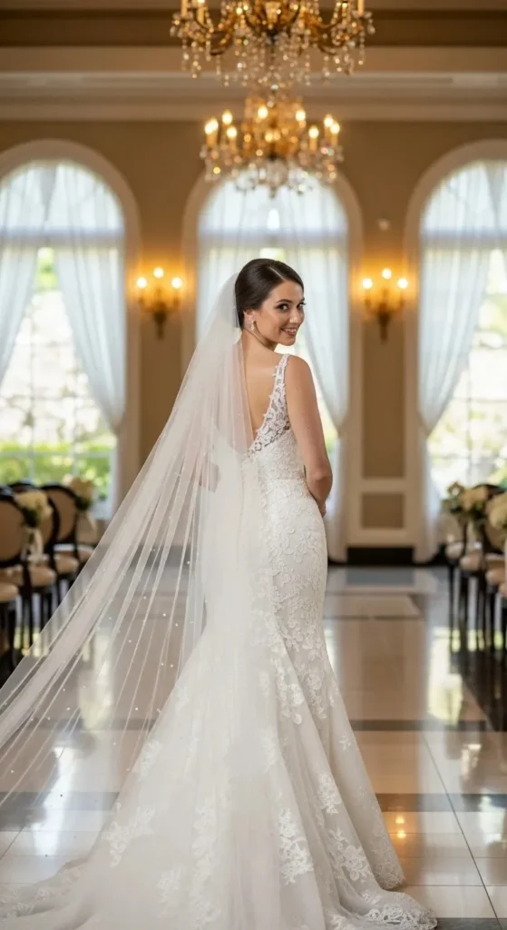 This combo works well in formal venues. Think ballrooms or large halls. The smooth fabric keeps things simple, while the long veil adds volume.