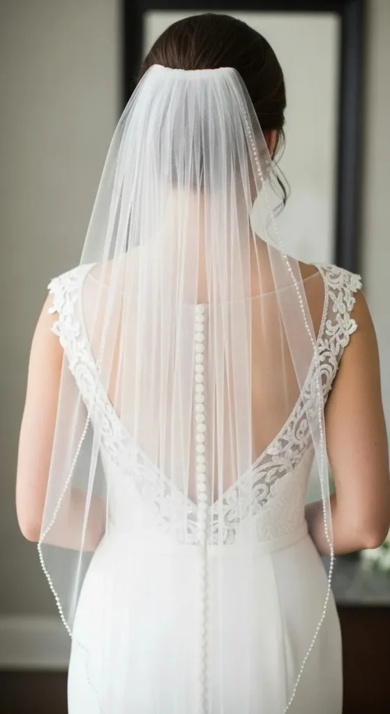 For a DIY touch, choose a simple veil and add tiny scattered beads or sequins. It catches light beautifully in photos.
