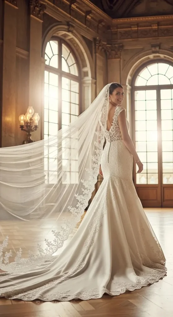 A long train paired with a cathedral veil creates a bold look.