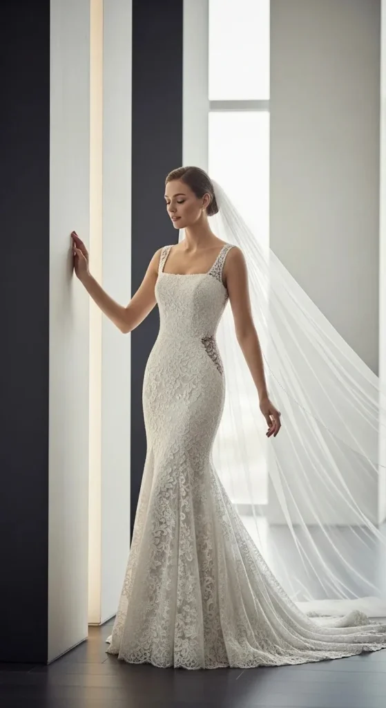 Square necklines are clean and modern. Pairing them with a fingertip veil keeps everything balanced and easy to manage.