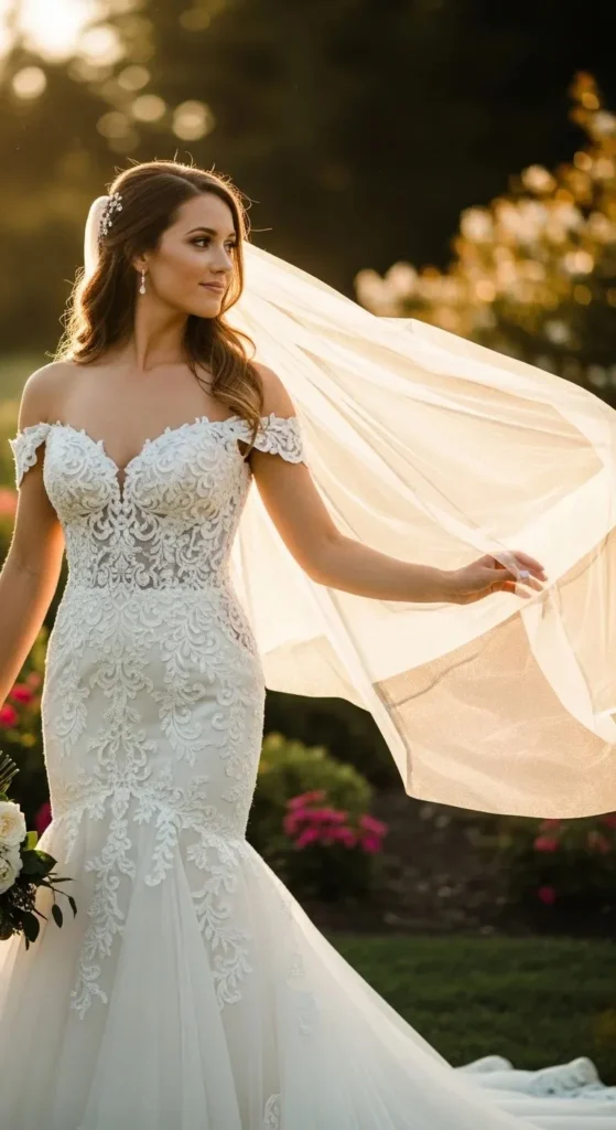 Off-Shoulder Mermaid with Sheer Veil