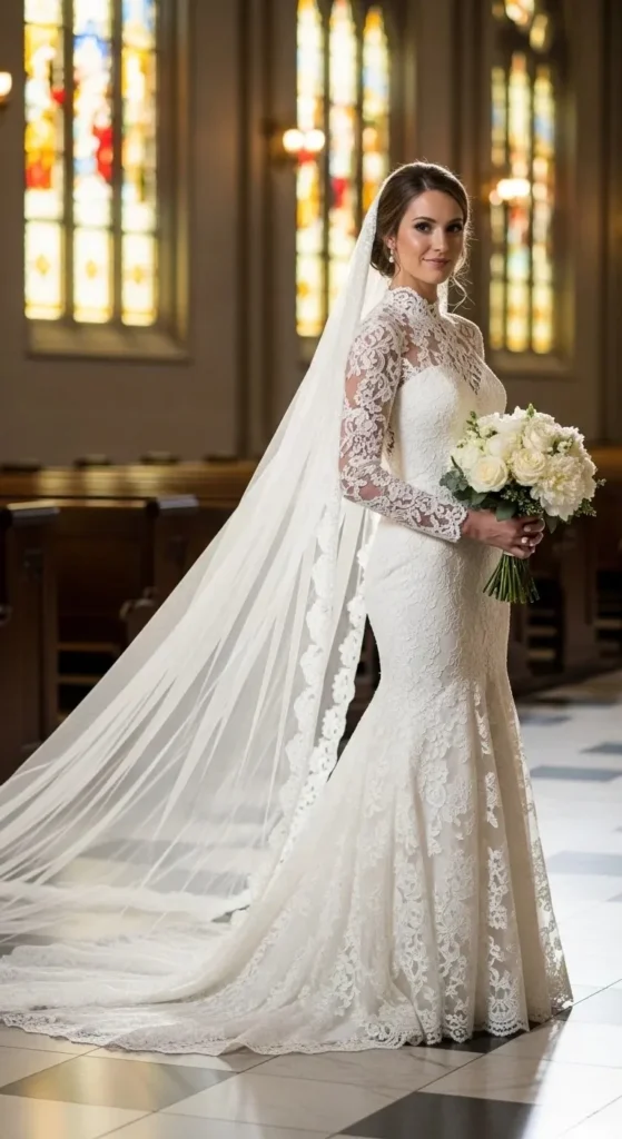 High-neck dresses feel modest yet stylish. A chapel veil adds drama.