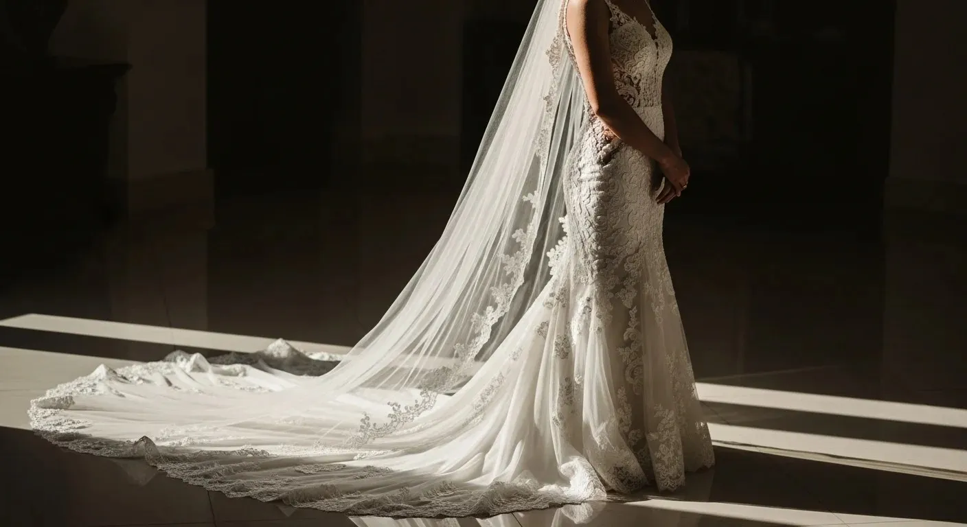 This combo works well in formal venues. Think ballrooms or large halls. The smooth fabric keeps things simple, while the long veil adds volume.