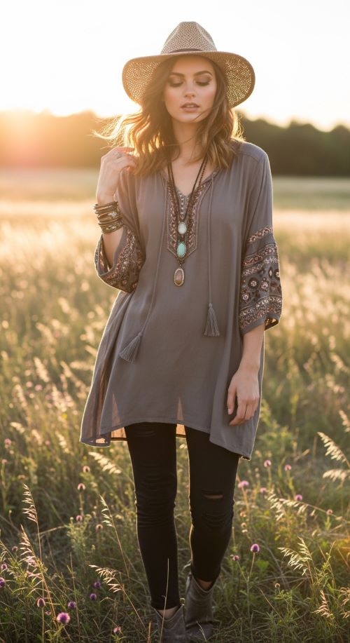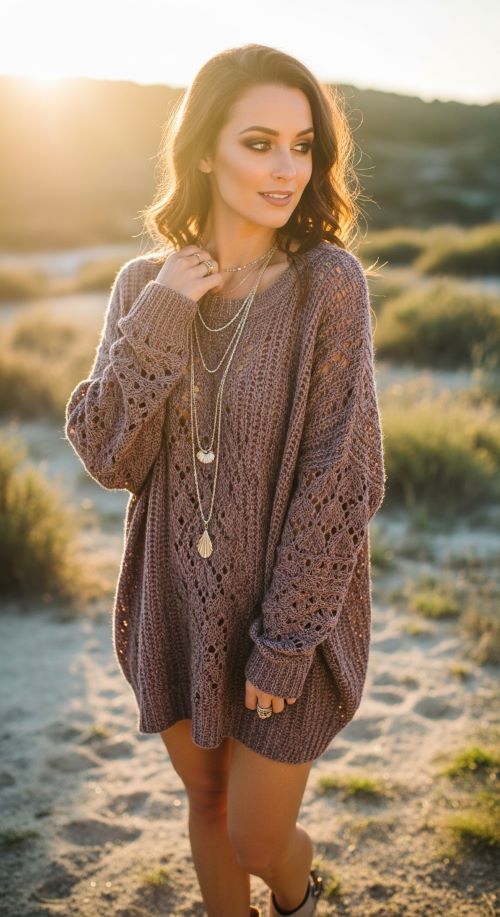 An oversized sweater creates a relaxed foundation for boho outfits. Pair it with fitted jeans or leggings to balance the shape. Neutral colors such as beige, grey, or soft brown work well for daily wear.