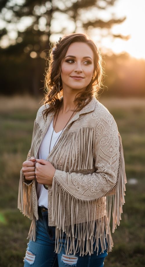 A fringe jacket adds texture and movement to simple outfits. Wearing it over a plain tee and jeans keeps the look balanced. Neutral fringe colors make it easier to style repeatedly.