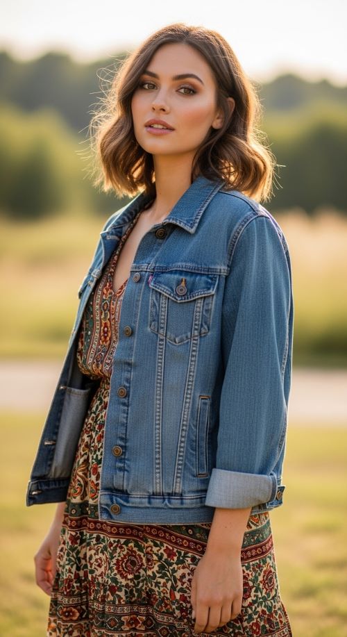 A denim jacket balances the softness of a floral dress. Choose a relaxed fit rather than a tight one. This outfit works across seasons and feels familiar yet relaxed.