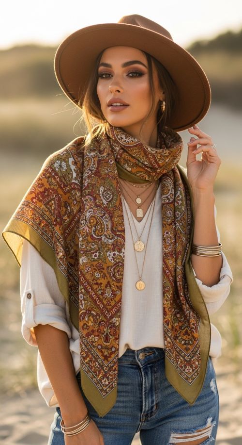 A printed scarf changes a basic outfit quickly. Wear it around your neck, in your hair, or tied to a bag. Scarves are affordable and easy to collect over time.
