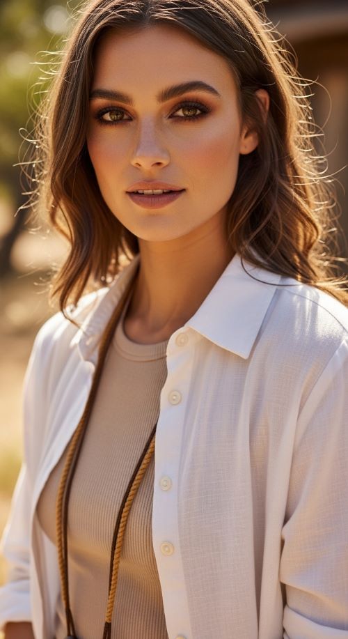 If you already own a loose cotton shirt, you can recreate this look by wearing it slightly open at the neckline and rolling the sleeves. Tuck only the front of the blouse to keep the shape casual. Footwear should stay simple, such as flat sandals, espadrilles, or canvas shoes.