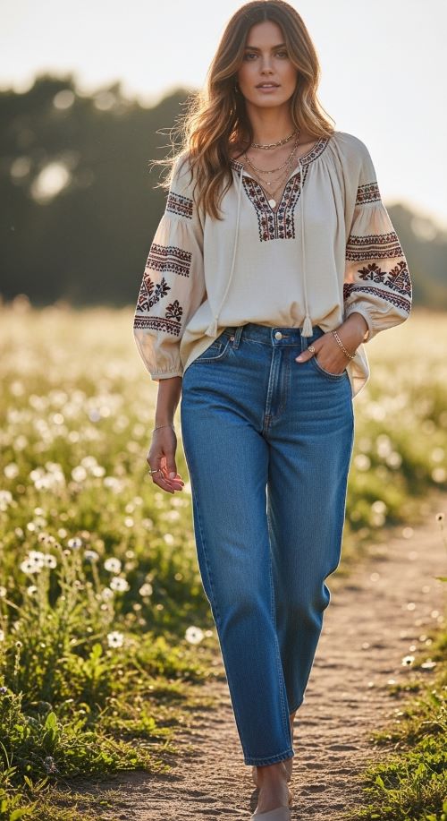 A peasant blouse adds softness to everyday outfits. Look for wide sleeves, gathered fabric, or light embroidery that feels subtle rather than bold. White, cream, and muted tones keep the look calm and easy to style. Pair the blouse with relaxed denim instead of tight jeans. Straight-leg or lightly flared styles balance the volume of the top.