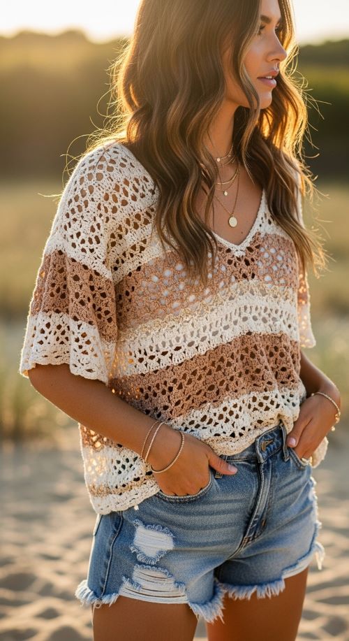 Crochet tops bring texture without feeling heavy. Pair one with denim shorts or loose trousers for a relaxed warm-weather outfit. Neutral crochet colors such as beige, cream, or soft brown are easy to style. If the top feels sheer, layering a simple tank underneath keeps it wearable.