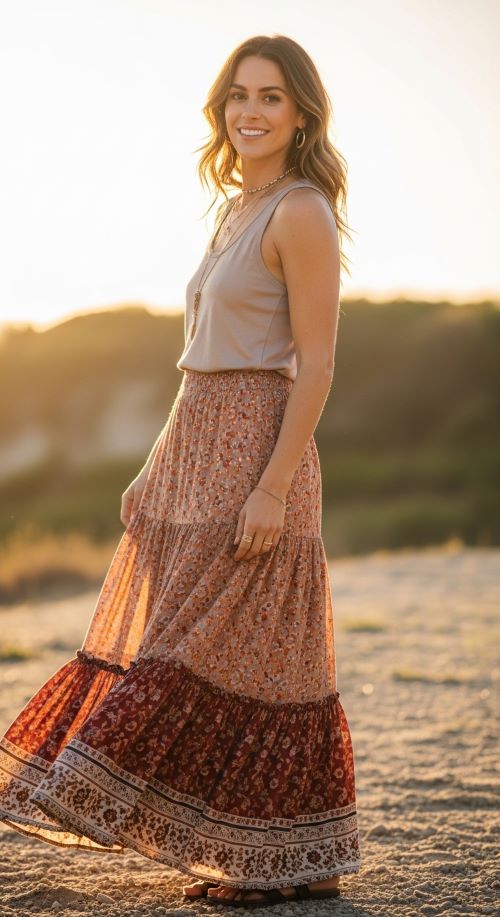 A tiered skirt adds movement and comfort. Pair it with a simple tank top to keep the outfit balanced. Cotton skirts work well for daily wear and feel light against the skin. Neutral tanks make the outfit easy to repeat.