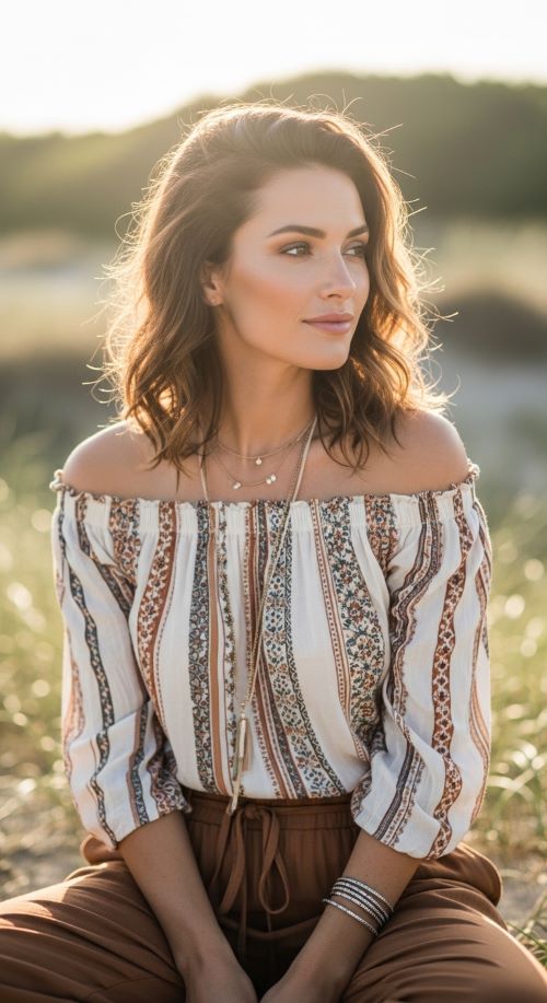 An off-shoulder top feels relaxed and soft. Pair it with loose pants or jeans. Keep accessories minimal and footwear comfortable.