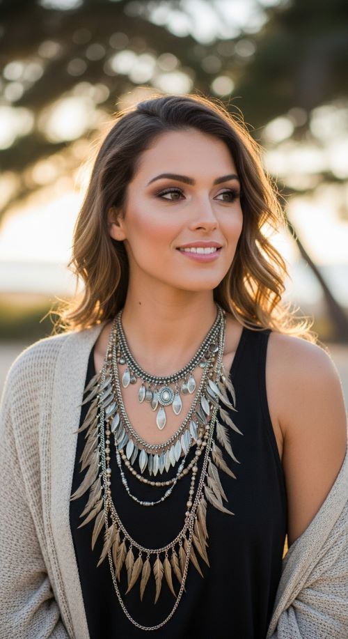 Layered necklaces add personality to simple outfits. Mix different lengths and materials. This works with tees, dresses, or sweaters.