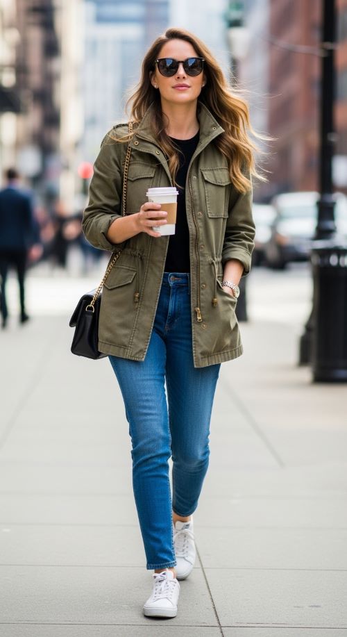 A simple combination like a utility jacket layered over a white t-shirt with classic blue jeans creates a timeless outfit. Pairing it with leggings and sneakers delivers a sporty, comfortable look perfect for errands or travel days. During cooler mornings, adding a hoodie underneath introduces warmth while giving the outfit a relaxed street-style feel. Even denim shorts with a tank top and ankle boots can look balanced when topped with a lightweight utility jacket.