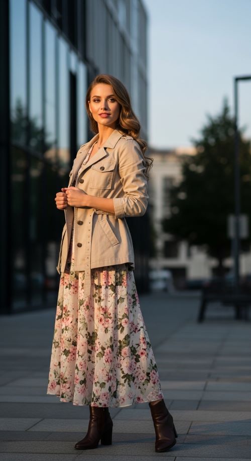 Wearing a utility jacket over a flowing midi dress balances feminine elegance with practical structure. Pairing it with tailored black trousers and heels instantly elevates the look, while styling it alongside a satin skirt and fitted top creates a refined modern outfit. A belted utility jacket can even replace a blazer, offering structure while maintaining comfort.