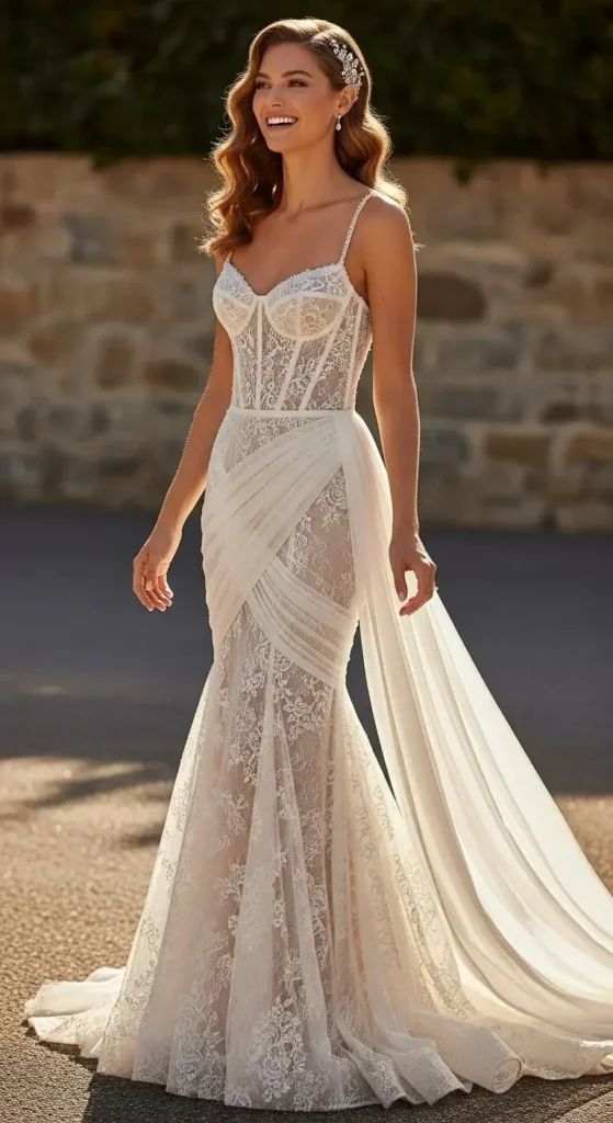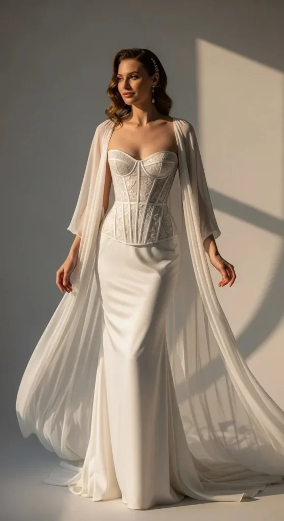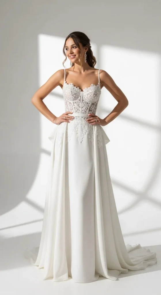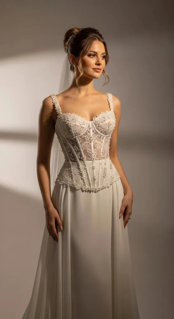 You don’t need a designer budget to try this. Look for second-hand gowns and add a structured corset overlay. Many local tailors can reshape the bodice for less.