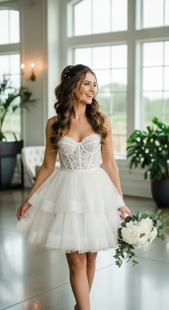 Short dresses feel fun and modern. A corset top keeps it elegant.